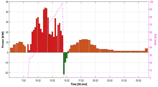Due to the residual energy produced, it is possible to recharge the fleet of vehicles in approximately 5 h, as Figure 19 indicates. The red curve shows the power used to completely recharge the fleet composed of five vehicles. This power is not absorbed by the network, but is entirely produced on site.
