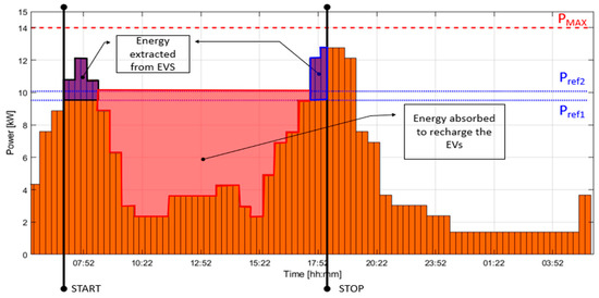 The red dashed line represents the maximum absorbable power before the protections are activated. The two dotted lines in blue, Pref1 and Pref2, represent the two control values of the algorithm. In particular, if the energy demand is higher than Pref1, then the energy is taken from the car rather than from the grid. If the requested power is below Pref1, then the cars are loaded, on the whole, with a power equal to Pref2. Naturally, the nominal power of the supply equipment must always be respected.