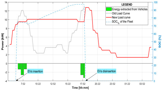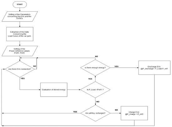 In Figure 21, it is possible to appreciate the final result of this algorithm. The dotted grey line represents the old load curve, while the red one shows the new load curve after the “peak shaving” algorithm is applied. The blocks in green represent the energy extracted from EVs to feed the parking in the phases of greater absorption, while the dotted blue line indicates the trend over time of the fleet’s State Of Charge (SOC). As noted, through this algorithm, the charging of EVs can be extended for up to 10 or 11 h. For conclusive purposes, the flowchart related to the “peak shaving” algorithm is presented in Figure 22.