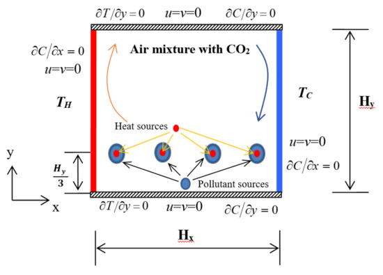 Recently, Serrano-Arellano et al. [21] numerically studied the transfer of heat and mass by natural convection in a square cavity with an air–CO2 mixture. The study was based on temperature and concentration gradients and the transition from laminar to turbulent flow. For high Rayleigh numbers and equilibrium buoyancy forces, the temperature was found to correspond to a comfort zone. Finally, Serrano-Arellano et al. [22] analyzed the effect of point sources of pollutants (CO2) on heat and mass transfer in a closed cavity. They concluded that point sources located near the lower wall decreased air temperature, while those located near the upper wall decrease concentration levels.
