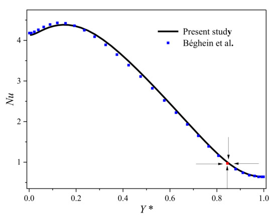 Various verifications of the developed numerical code were carried out, and a comparison was done with the study by Béghein et al. [31] where the heat and mass transfer were analyzed by natural convection in a laminar flow regime for a closed cavity. The study was performed for a value of the Rayleigh number at 104. In Figure 2, the comparison of the values of the Nusselt number and the local Sherwood number on the hot wall is shown. The comparison presented a maximum difference of 2.91% at a height of 0.845.