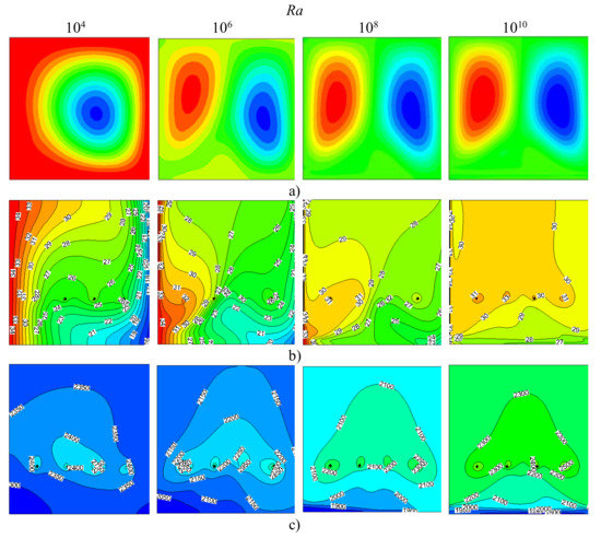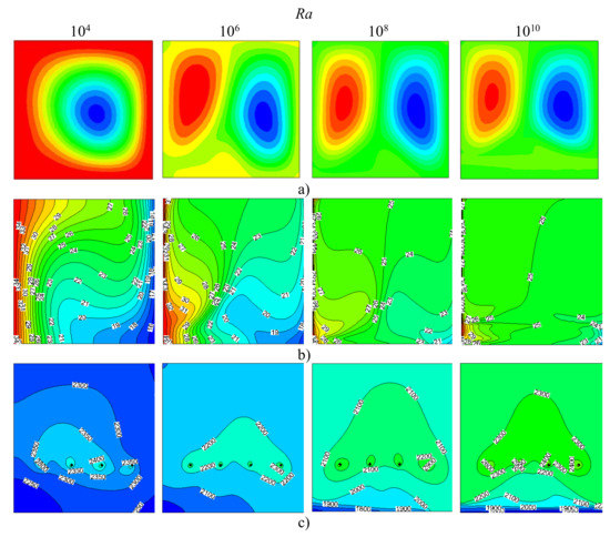 In Figure 5b shows that the temperatures pattern was distorted by the pollutant sources, which was more notable for the low Ra values (Ra ≤ 106); nevertheless, when the Ra became higher, the isotherms tended to agglutinize inside the cavity, near the hot and cold walls, respectively. It is worth noting, however, that the temperatures values had a tendency to a constant value, which meant that the rise in the flow intensity tended to homogenize the values of the variables inside the cavity.