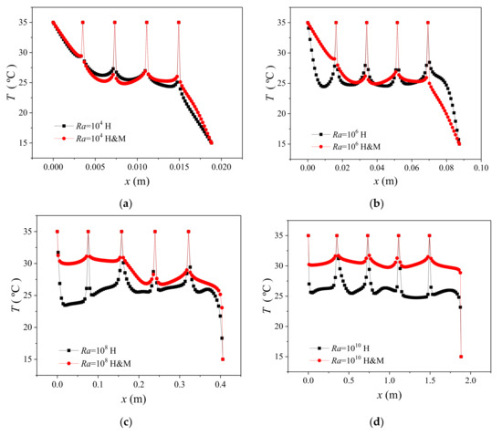 Hereafter, the graphs showing the temperature changes registered at the level of the heat sources are described. The temperature changes described occurred, in the first case, considering only heat sources and, in the second case, considering the double diffusion as a simultaneous effect when having both the heat and pollutant sources. Figure 7a shows that, when the pollutant sources were added, an increase and decrease in the temperatures was created around the areas close to the heat and pollutants sources, respectively. Apart from that, when the Rayleigh number was increased to Ra = 106, according to Figure 7b, the temperatures remained high at the middle of the cavity, on the hot wall side. On the contrary, on the cold side, the temperatures were below the values in the scenario where only the differentially heated cavity was considered. The described behavior disappeared when the Ra value increased, in that from Ra = 108 the temperatures registered at the height of the heat sources increased by 5 °C approximately. This occurred in the first part of the cavity. For the value Ra = 1010, the increase in the temperature was evident in the whole cavity. The results indicate the importance of the influence of the mass transfer on the heat transfer. Figure 7d shows that the behavior of the temperatures was analogous to with the heat sources alone but at a different intensity (5 °C, approximately).