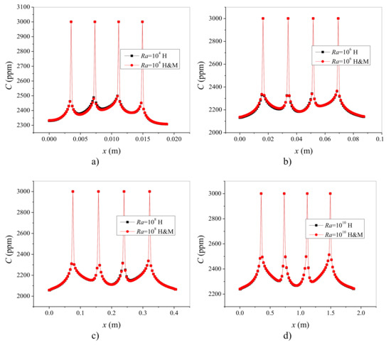 Local concentrations at the height of the simultaneous heat and pollutant sources, for values of the Rayleigh number of (a) 104, (b) 106, (c) 108 and (d) 1010. H (with heat sources) and H&M (with heat and pollutant sources).