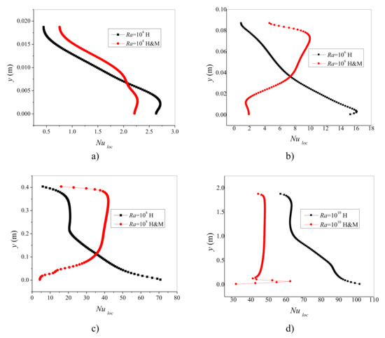 Local Nusselts numbers on the hot wall for values of the Rayleigh number of (a) 104, (b) 106, (c) 108, and (d) 1010. H (with heat sources) and H&M (with heat and pollutant sources).