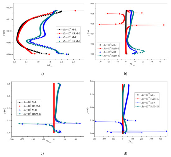 Local Sherwood numbers on the hot and cold wall for values of the Rayleigh number of (a) 104, (b) 106, (c) 108 and (d) 1010. M (with pollutant sources), H&M (with heat and pollutant sources), L (left wall), and R (right wall).