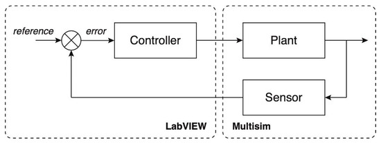 Co-simulation between LabVIEW(controller) and Multisim (plant and sensors).