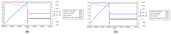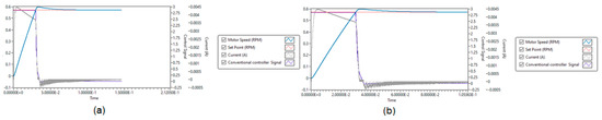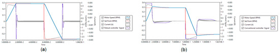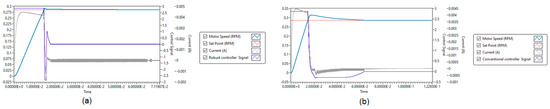 Robust controller (a) and conventional Proportional-Integral-Derivative (PID) controller, (b) dynamic speed response in Per Unit system (P.U.) when speed reference is 0.27 P.U. time in seconds.