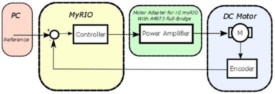 The power amplifier is a full-bridge developed by AllegroTM that includes the Motor Adapter to NI myRIO. The plant is a 12-V DC motor with an encoder for sensing speed, as well as the electrical/mechanical parameters (see Section 4.1 for details). The MyRIO digital system and the power amplifier are used in undergraduate engineering classes because they have a friendly interface. Note that the design of the SMC-ON controller does not require knowing the motor’s settings, as shown in Section 3.