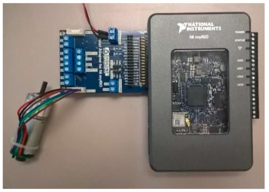 A MyRIO system was selected to run the control algorithms in real-time (see Figure 8). This digital system is used to implement several control systems to functional prototypes in universities and industries; moreover, it is used in regular engineering classes since it has friendly interface with LabVIEW. It includes ten analog inputs, six analog outputs, 40 digital I/O lines, WiFi, LEDs, a push button, an onboard accelerometer, a Xilinx FPGA, and a dual-core ARM Cortex-A9 processor (National Instruments). The load torque is applied while using another DC motor coupled to the motor shaft that moves in the appositive direction so the load torque can be changed using a PWM (pulse width modulation) technique to apply the desired load torque. The nominal values are: nominal torque = 1.27 [kg/cm], nominal speed 332 (RPM), armature current = 1.47 Amps, Output-power = 4.33 Watts, and Efficiency = 25%.