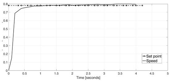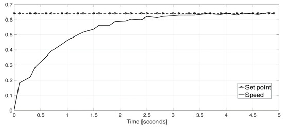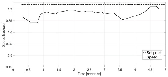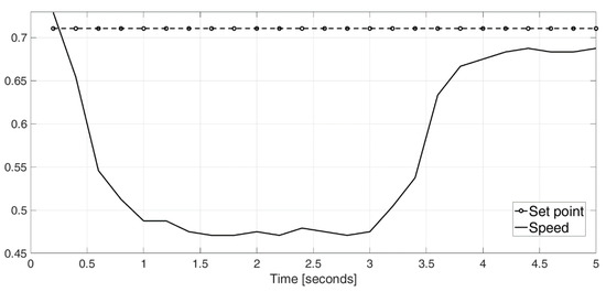 A disturbance of 1.5 times the nominal load is added to the DC motor. Figure 11 and Figure 12 show the responses for the disturbance case for PID and SMC-ON. It can be observed that the PID controller is less robust than the proposed one, because the velocity remains closer to the set point compared with the response of the PID controller. Future work could include the comparison of the proposed controller against other sliding mode controllers with different structures, as presented in [43].