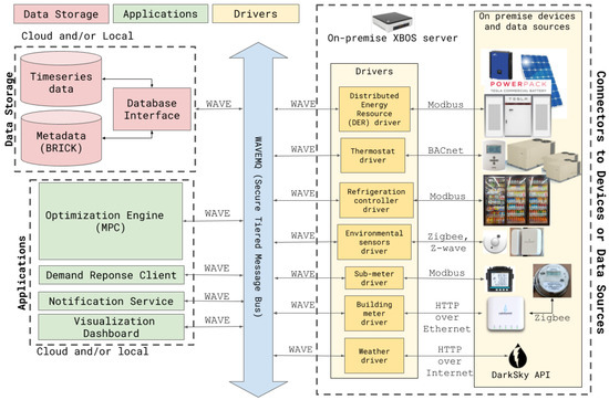 To coordinate the numerous heterogeneous connected devices and controllers within a building, robust network communication is a key requirement. Most commercial and academic solutions use middleware, i.e., software that resides between the hardware devices and other data sources that produce data and the applications that use these data. SPO uses XBOS, an open-source building operating system developed for real-time data acquisition from sensors and control of building actuators [65]. XBOS consists of the following components: