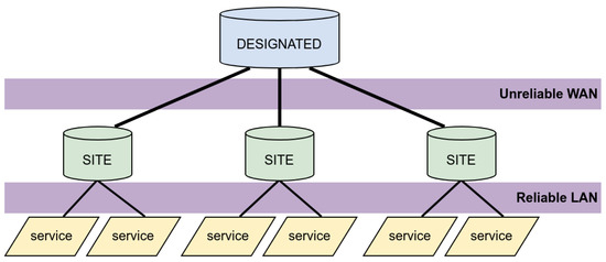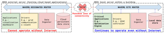 WAVE is “an authorization framework offering decentralized trust: no central services can modify or see permissions and any participant can delegate a portion of their permissions autonomously” [67]. WAVEMQ is a tiered publish-subscribe message bus that all drivers and applications on XBOS use to transmit messages [68]. WAVE-based keys and permissions authorize drivers and applications to communicate with one another. The tiered nature of WAVEMQ is implemented in the form of a single “designated router” that is deployed on reliable hardware, typically located in the cloud, and additional message routers at each site, called “site routers”, as illustrated in Figure 2. The services, which can be drivers or applications that have been granted the required WAVE permissions, can publish (i.e., write) on or subscribe (i.e., read) to a particular topic (i.e., sensor measurements or actuation commands) on the bus.