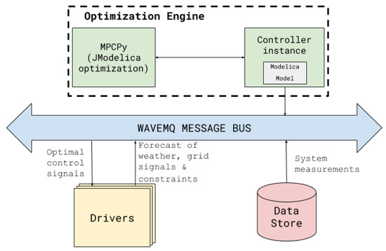 Existing solutions often use proprietary platforms and site-specific specifications for generating and sending optimal control signals to devices. Similarly to how XBOS is used as middleware platform by SPO, the open-source package MPCPy [73] is used to implement MPC-based optimization in an extensible and open-source framework. SPO integrates MPCPy as an XBOS application, extending its capabilities to interact with real-time systems. This application, labeled as the “Optimization Engine” queries historical data and future forecasts from the data store, solves the optimization problem using the MPCPy framework and publishes control signals to devices through WAVEMQ. Figure 4 depicts this interaction between the optimization engine, the data store and the device drivers. Through this implementation, SPO provides a scalable, protocol- and manufacturer-independent solution for implementing advanced building controls. This section details the components of the optimization engine.