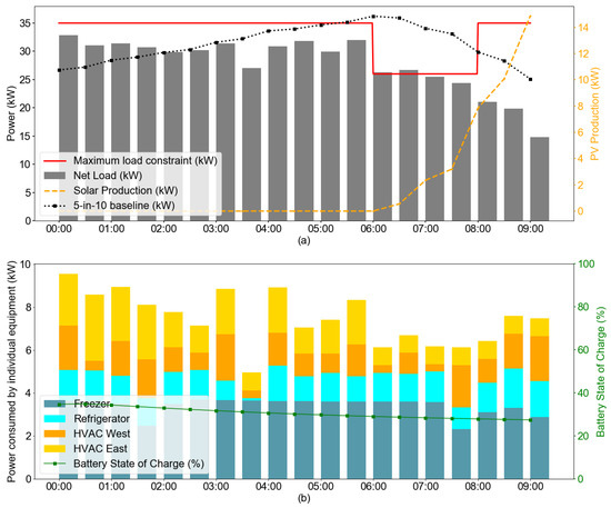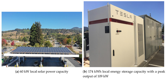 The store is typically open 24 h a day, 7 days a week and serves frequent customers throughout a day. The space inside the store is conditioned by two separate two-stage roof top units (RTUs), virtually (but not physically) dividing the store into an “east zone” and a “west zone”. These RTUs are controlled by individual thermostats that have been installed in the corresponding zones. The store also has a walk-in refrigerator for storing and displaying beverages through a set of glass reach-through doors and a walk-in freezer for storing and displaying ice-cream and frozen food. The site has 60 kW of local solar power generation capacity along with a battery with 174 kWh of energy storage (and power capacity of 109 kW). As seen in Figure 5, the solar panels are installed on the gas station canopy and the energy storage unit is a Tesla Powerpack.