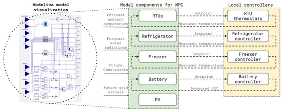 Research on advanced control strategies and algorithms (e.g., MPC and reinforcement learning) with application to building systems and DERs has grown significantly in the last decade [16], as the potential of these advanced controls to provide flexibility to the electrical grid has become more evident. Previous studies have investigated MPC applications in a range of HVAC and thermal energy storage systems in buildings: These include MPC utilizing an ice storage tank and building thermal mass [17,18]); MPC for Air Handlers (AHU) and Variable Air Volume (VAV) systems [19,20,21]; and MPC applied to window operation for mixed natural and mechanical ventilation in an office building [22,23]. Studies have also demonstrated the coordination of HVAC, energy storage and PV generation using MPC based controls in simulated commercial buildings [24,25,26,27]. However, most of these studies developed customized solutions, closely tied to the specific building and equipment setup; the gap that this work fills is an MPC application that is built to be extensible and scalable.