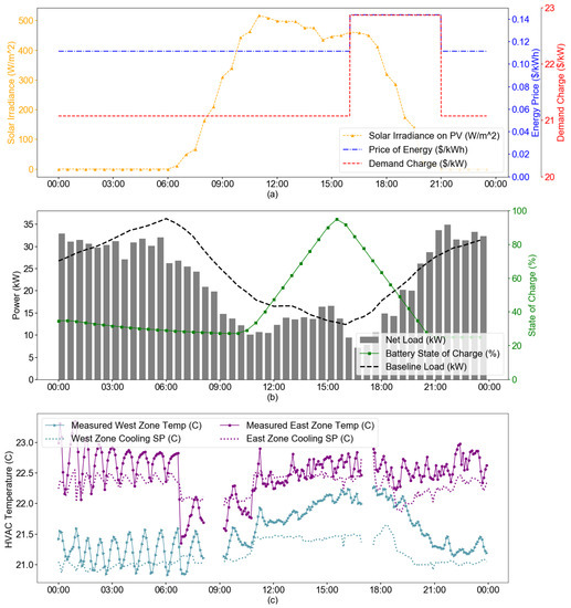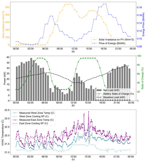 (a) SPO’s response to hourly dynamic prices and varying solar irradiance. (b) Through battery discharge and reduction in building load, where the net load is minimum during high price times and the battery charges during the low price times anticipating the high price period. (c) SPO changes the thermostat setpoints to vary the zone temperature. Preferred temperatures: 20.56 C (69 F) for the West Zone and 21.67 C (71 F) for the East Zone.