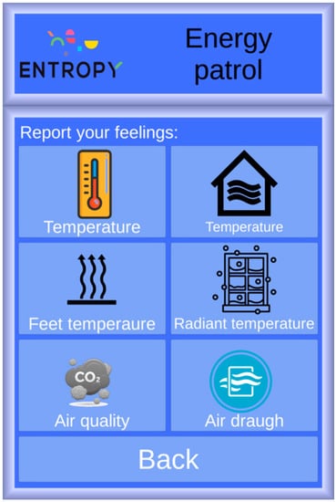 A recent approach suggests to apply users-centric models through the use of IoT [12]. Humans are used as sensors, so that changes in temperature can effectively improve occupants’ comfort [13]. Researchers implemented several methods to achieve this goal: energy plus simulation [14], human machine interface [15,16,17,18], and portable devices, among others. In this context, mobile apps are widely used to evaluate subjective parameters [19] and to have real-time feedback about thermal sensations [20,21]. Li et al. in [22] gave an interesting contribution to determine the optimum space conditioning mode basing on users’ votes. In most cases, the mobile device is part of a platform that involves other tools, too. For instance, many studies integrated connections to the building management system (BMS) to increase thermal satisfaction and energy-saving [23,24,25]. Likewise, other studies discussed an approach that also considers the heat balance equation of the human body, through both smartphones and wearable devices [26,27].