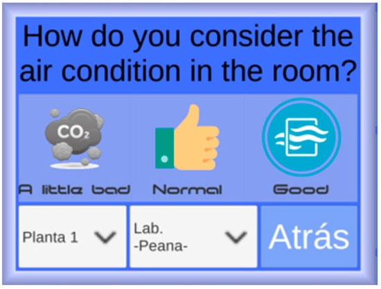 Although air condition does not directly affect the thermal perception of occupants, it does affect the global sensation of dissatisfaction. It is for this reason, and to make sure that the research was holistic, we included a module on the app that would allow users to be compliant with air quality. According to British Standard BS EN 15251:2007 standard, the presence of CO2 has to be monitored and limited in both residential and non-residential buildings. The required ventilation is based on comfort and health criteria, but a common standard index does not exist for indoor air quality. Hence, the standard proposes the expected percentage of dissatisfied according to three different methods: based on persons and building component, based on ventilation rate per person, based on CO2 concentration in energy balance. In the questionnaire (Figure 3), a last three-option item is proposed to estimate the following: