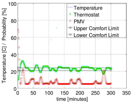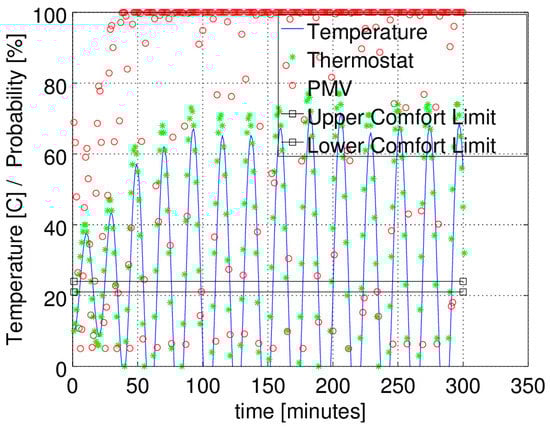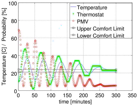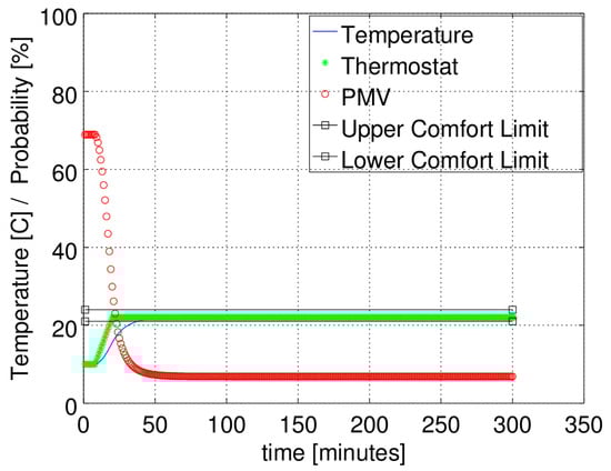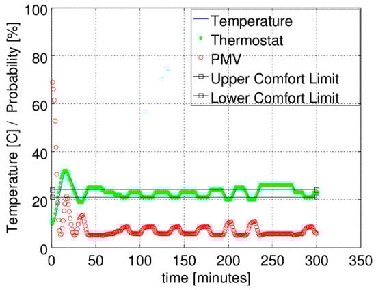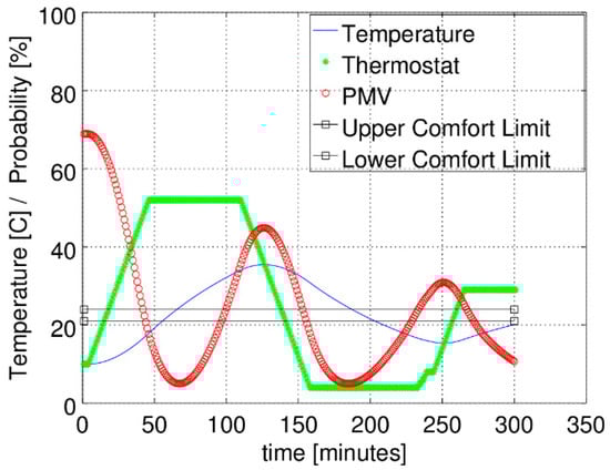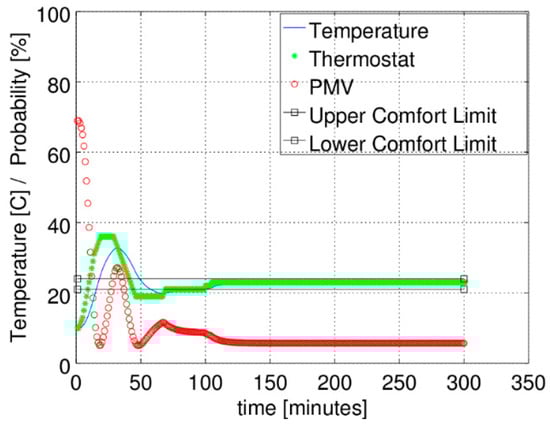 Several aspects have to be considered when studying a control system; as the case presented here does not have an analytic expression, we ran several simulations with different parameters to provide light on the phenomenon. Figure 7 shows a response of the building together with the value of the thermostat chosen by the smart thermostat block, the comfort limits, and the PMV in percentage. We can see in Figure 7 that the closed-loop system has at least order two, as there exists an oscillation at the beginning of the response. This implies that the control loop can lead to a sub-damped system and an over-damped system. Depending on the requirements of the users, the controller will have to consider this and, overall, must avoid the system getting into resonance and becoming unstable.