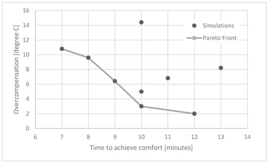 It seems then that these kinds of controllers for IoT control of the thermal comfort point to a multi-objective optimisation for the finding of the optimal parameters that minimise time to reach comfort and overcompensation. The result of these types of algorithms is the so-called Pareto front. Pareto fronts are a subset of points of the decision space, in which none of the points are worse than any other point in both objectives. The results of the simulations are shown in Figure 14.