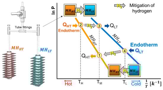 To operate the MHHP cycle based on the equilibrium thermodynamic characteristics of the metal hydride, at least one pair of metal hydride alloys with different equilibrium temperatures at a given pressure has to be selected. One with higher equilibrium temperature is referred to as “HT” and the other to “LT” of the subscript letter in this paper (Figure 1, Figure 2, Figure 3 and Figure 4). Figure 2 (left) shows the actual metal hydride reactor pair used in the experimental setup in the MHHP system illustrated in Figure 4 [7]. The two reactors filled with different metal hydride alloys, and that allow cyclical hydrogen exchange through the tube fittings between the reactor pair. The vertical part of the tube fitting with a valve is prepared to charge hydrogen initially. Figure 2 (right) is the thermodynamic cycle diagram of an MHHP system illustrated in the van’t Hoff plot [4]. cycles between temperatures and with corresponding equilibrium pressures of hydrogen at States 1 and 2. cycles between temperatures and where its corresponding equilibrium pressures of hydrogen are at States 3 and 4, respectively.