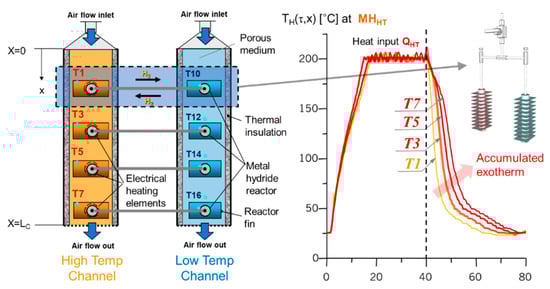 where, is a number of the dual MHHP units arrayed in the channel, is the amount of hydrogen associated with metal hydride alloy bulk (mole), is reaction enthalpy of metal hydride (kJ/mol·H2), m is mass (kg), c is specific heat (W/m3∙°C) when the subscript m denotes for metal hydride alloy bulk, r for reactor and p for porous media. The relationship between the adiabatic temperatures of high- and low-temperature channels, according to Equation (15) is: