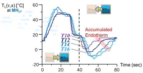 Figure 5 shows the most important results that demonstrate the formation of induced heating and objective cooling effects (targeted temperature) by a pair of AB2 type metal hydrides of Zr0.9Ti0.1Cr1.0Fe1.0–Zr0.9Ti0.1Cr0.6Fe1.4. The former is used for and the latter for . The system was successfully able to produce both the 60 °C of heating and −15 °C of cooling in the low-temperature channel by use of heat input at 200 °C in the high-temperature channel.