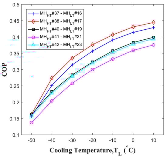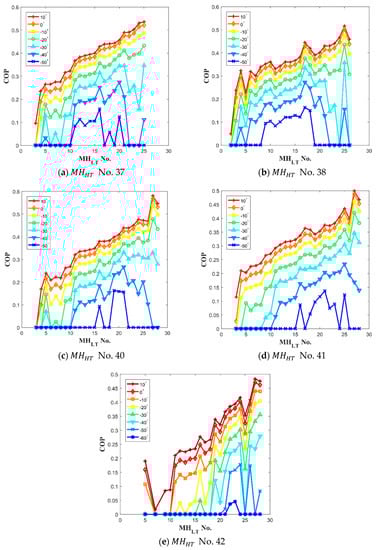 The results of the numerical calculation from Equation (24) provide the based on the induced heat of cooling in a range between objective cooling temperature () and ambient mean temperature () for each hydride pair as show in Figure 6. At −50 °C of the cooling temperature, a few reactors showed a high value. The high values at the lowest temperature indicate that the system using the optimized pairs can operate at the lowest cooling temperature. For example, only No. 11 to No. 16 for No. 37 can generate the lowest temperature shown in Figure 6a. In addition, among those , No. 16 shows the highest value as shown in Figure 6a. The results in Figure 6a–e clearly show specific optimized pairs having the highest value at −50 °C of the cooling temperature.