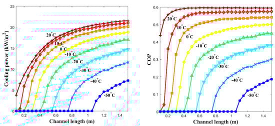 The and the specific cooling power with various channel lengths were calculated and obtained with the results shown in Figure 8 when the free thermal wave velocity of 10 cm/min that is in linear proportion to the gas velocity is applied. 30 °C of the is applied in the calculation of Equations (23) and (24). There is a certain elevated temperature of thermal wave propagation formed by the exotherm of the absorption process from the reactor channel (a leading elevated temperature wave) before the propagation of the induced effective thermal wave of cooling in the low-temperature channel. Therefore, it is important to design the channel length to keep the proper distance between the leading elevated temperature wave and the following low-temperature wave. For instance, when the channel length is too short, the following low-temperature wave goes just behind the leading elevated temperature wave, and both waves get into reciprocal action during their propagation into the low-temperature channel, which drives the operation results into the reduction of the wave amplitudes at the end of the channel where the cooling effect has to be gathered. On the contrary, when the channel length is too long, there are no certain positive gains to the or the specific cooling power since its cycle frequency is made longer, which eventually drives the net power of the system into a lower level. According to the calculations, it is estimated that 0.9~1 m of the channel length provides the optimized output of the system, as shown in F.
