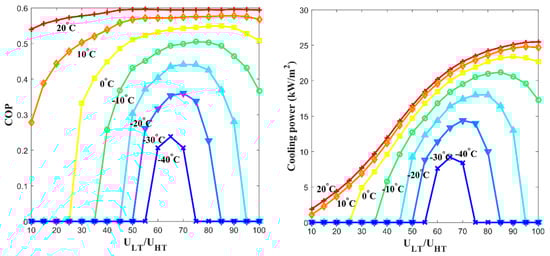 Figure 9 presents the calculation results of the and specific cooling power when the system varies the ratio of the free thermal wave velocity in the low-temperature channel to the one in the high-temperature channel (/). When the velocity in the low-temperature channel was 65% of the velocity in the high-temperature channel, the best and specific cooling power were obtained among most of the cooling temperature range.