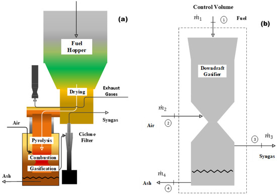 (a) Physical diagram of the system, and (b) control volume of the downdraft gasifier.