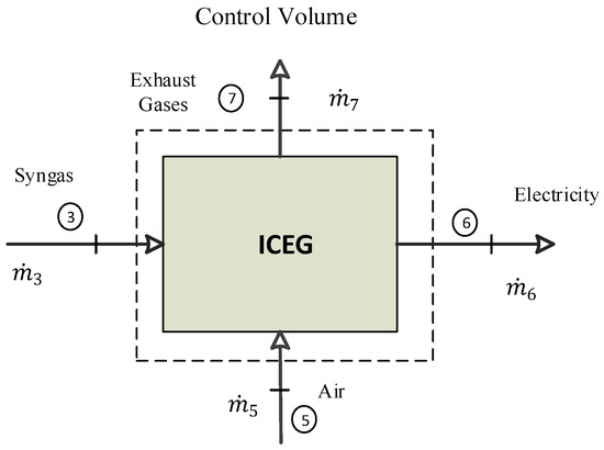 The energy balance for the ICEG is configured as follows. The energy of the syngas that enters the ICEG is calculated by the Equation (12), shown below. The complete combustion of syngas depends on chemical composition. The general equation for the complete combustion of syngas with the theoretical amount of air required is given by: