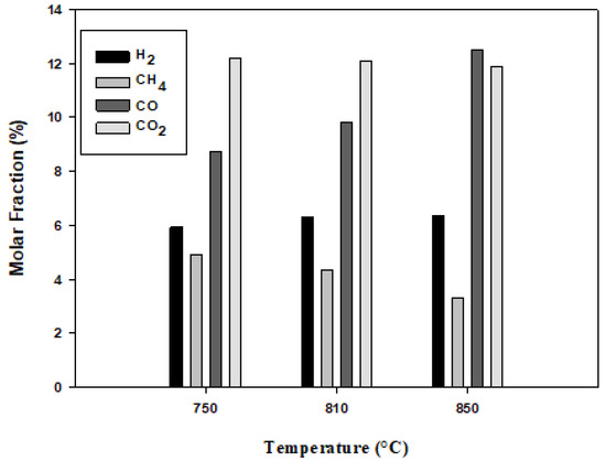 Molar fraction as a function of gasification temperature for the acacia residues.