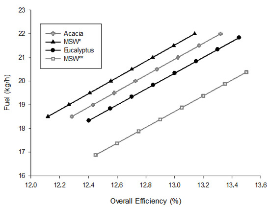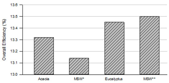 Figure 6 shows the Sankey diagram of the energy flows for the proposed unit which includes the flow for the downdraft gasification system and the flow for the ICEG. The energy rates of each current vary accordingly to the LHV of the used fuel. The fuel processing capacity of the gasification system is limited to 22 kg/h, so fuels with lower LHV (acacia and MSW *) generate less energy. The energy contained in the fuel (biomass and MSW) is converted into physical and chemical energy of the syngas during the gasification process, thermal energy and solid waste become the main loss sources during this stage of the process, representing 26% for the acacia (Figure 6a), 27% for the MSW * (Figure 6b), 25.3% for the eucalyptus (Figure 6c) and 25% for MSW ** (Figure 6d). The syngas is combusted in an ICEG to generate electricity, the energy losses at this stage are the largest of the system, representing 60.7% for the acacia, 59.9% for the MSW *, 61.3% for the eucalyptus and 61.5% for MSW **. These losses are given mainly to the heat energy loss by the exhaust gases and the ICEG system. The overall efficiency of the system is approximately 14%. One possible route to reduce these losses is by implementing a cogeneration system that, in addition to producing electricity, will generate hot and cold water increasing the total efficiency of the system.