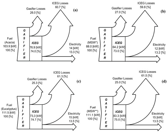 Sankey diagram of the gasification system-ICEG for: (a) acacia, (b) MSW *, (c) eucalyptus and (d) MSW **.