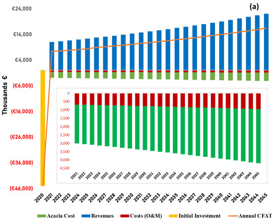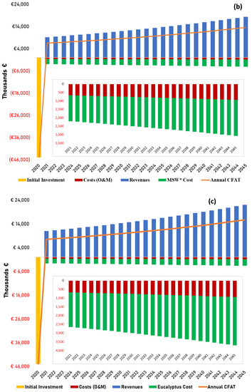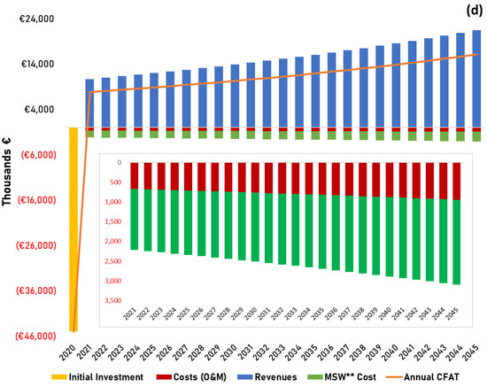 In the case of Portugal, the calculation of taxes on profits and the fiscal incentives granted by the government for certain regions in the interior of the country were considered, coinciding with the area foreseen for the installation of this type of technology. Therefore, for the Portuguese scenario, a reduced tax rate of 15% was considered. As for Brazil, the tax burden is one of the highest in the world, over 32% [44], still, companies that generate energy from renewable sources (biomass included) benefit from a series of government tax incentives that reduce these charges up to 17% [39].