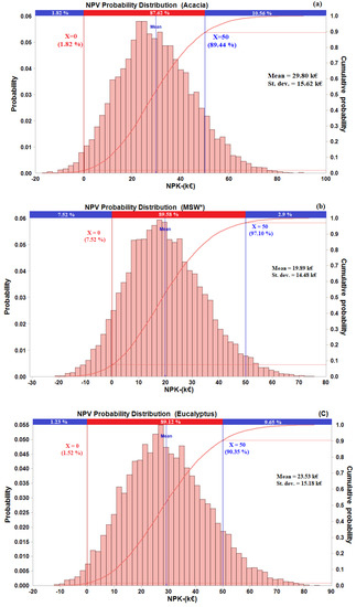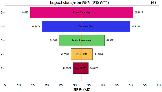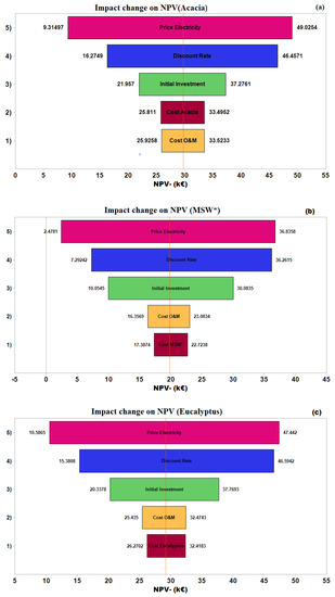 The economic analysis of biomass gasification is important and necessary to determine the cost of energy production and ensure the viability of the project. As an effort to bring this analysis closer to a real application scenario the present study was built based on literature review related with gasification investment projects [20,25]. The proposed 15 kW downdraft gasifying units coupled with an ICEG are set for deployment within a Portuguese and Brazilian decentralized community settled in a rural scheme. The small-scale units are set to be lodged within the community located near forest and agriculture landing for higher biomass availability with impact on transport costs and profitability of the supply operation. In Portugal, acacia is an invasive plant and estimates say that it occupies an area of approximately 43 thousand hectares, whereas in Brazil eucalyptus plantations reach around 7 million hectares [31,32]. An MSW supply chain is also considered arriving from surrounding urban areas and from the community itself. This supply chain profits from the already existing solid residues collection network to the urban areas and local communities. In Portugal, the average production rate of MSW is 1.32 kg per capita per day, making approximately 13.58 thousand tons of MSW per day, while in Brazil the average generation of MSW per capita is 1.15 kg of MSW per capita per day, approximately 234 thousand tons of MSW per day [20,33]. A near existing power line is assumed to connect the unit to the grid. The unit operation is assumed to be monitored by local workers already performing other tasks within the community, thus neither units require fully dedicated labor allowing to save on employees’ costs [34]. For the economic evaluation, the main input financial data regulated in each country, Portugal and Brazil, such as input, capital and operating costs, alongside other key financial assumptions are provided in Table 6. For uniformity purposes, all costs were converted to euros (€).