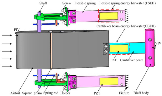 To focus on the two-DOF airfoil-based piezoelectric energy harvester system and take place the plunge–pitch motions, the airfoil is mounted by a span-wise shaft. The shaft is fitted with the bearings at both ends, which can rotate around the bearing. The spring rod can constrain the rotational motion to emulate the pitch motion to some extent. The flexible spring can produce the bending deformation to stimulate the plunge motion. In addition, the cantilever beam is connected to the airfoil at the fixed end and the bluff body is installed at the free end. When subjected to the incoming airflow, the cantilever beam and the airfoil undergo VIV and FIV in transverse direction, respectively. The hybrid excitation of FIV and VIV is first adopted in the proposed harvester system by attaching a cantilever beam to the trailing edge of the mobile airfoil, as shown in Figure 1, with intent to improve the aeroelastic vibration and enhance the harvesting performance. Because of the great distance between the flexible spring and airfoil, the effect of the fixture and flexible spring on the vibration response of VIV is not considered. This harvester system under consideration mainly consists of an airfoil, two flexible springs, a cantilever beam, and a cylindrical bluff body. Two piezoelectric patches (PZT-5H) are attached to the end of the flexible spring and the cantilever beam, respectively, which are composed of the flexible spring energy harvester (FSEH) and cantilever beam energy harvester (CBEH), respectively.
