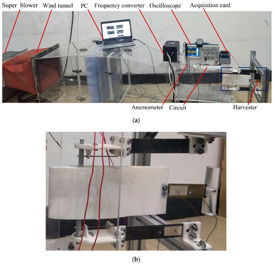 Experimental setup: (a) harvester system; and (b) enlarged figure of the harvester.