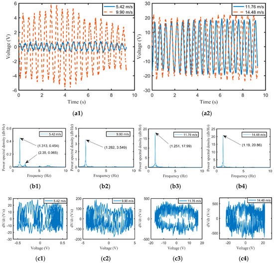 Time history, power spectral density, and phase portrait of output voltage for FSEH-130-20 at 5.42, 9.90, 11.76, and 14.48 m/s: (a) time history; (b) power spectral density; and (c) phase portrait.