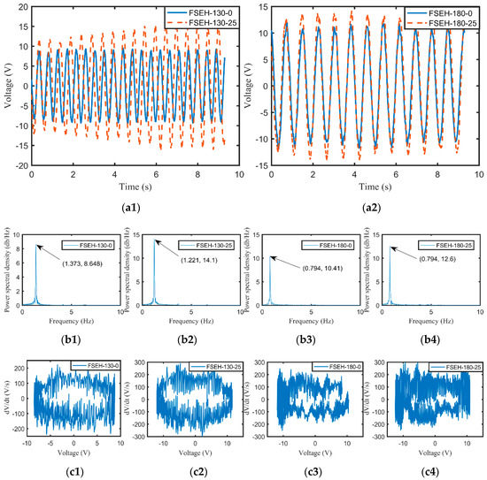 Focusing on showing more directly the coupling effect on the vibration characteristic of FSEH, Figure 7 illustrates the variation of output voltage with time for FSEH-130-0, FSEH-130-30, FSEH-180-0, and FSEH-180-30. Time refers to the actual measured time instance, and without any treatment.