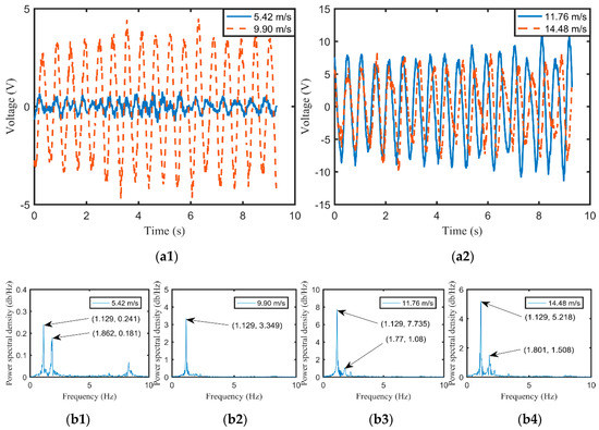 The coupling effect is mutual in the harvester system, and it could exert a vital influence on CBEH. Figure 5 illustrates the time history and the power spectral density of output voltage for CBEH-130-30 at 5.42, 9.90, 11.76, and 14.48 m/s.