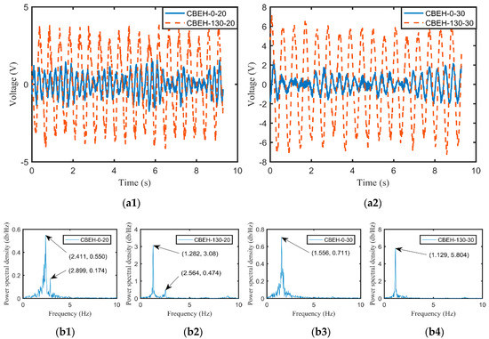 Time history and power spectral density of output voltage for CBEH-0-20, CBEH-130-20, CBEH-0-30, and CBEH-130-30 at 10.52 m/s: (a) time history; and (b) power spectral density.
