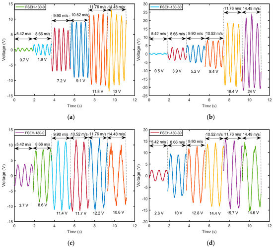 Variation of output voltage with time at various airflow velocities for different harvesters: (a) FSEH-130-0; (b) FSEH-130-30; (c) FSEH-180-0; and (d) FSEH-180-30.
