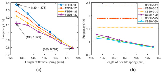 Fundamental oscillation frequency of various harvesters as a function of the length of the flexible spring at 10.52 m/s: (a) FSEH; and (b) CBEH.