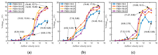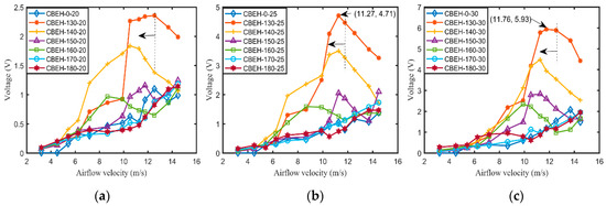 Variation of output voltage with the airflow velocity for the CBEH: (a) 20 mm; (b) 25 mm; and (c) 30 mm.