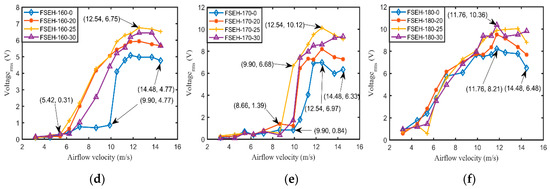 As shown in Figure 9a–f, when the flutter onset of velocity is exceeded, the output voltage of the harvester increases rapidly, attains to a maximum value, then flattens gradually, and ultimately decreases slowly with the airflow velocity. It is noted that, as the length of the flexible spring is increased, the effect of FIV on the output voltage gradually weakens for various harvesters. However, FSEH demonstrates clearly the poor output performance with the length of the flexible spring increase, and the obvious decreasing trend occurs at the higher velocity for the longer FSEH. The root mean square output voltage of FSEH is distinctly improved compared to the systems without the bluff body attached to the trailing edge of the airfoil, for example FSEH-130-0 and FSEH-150-0. That is because the VIV generated by the cylindrical bluff body can augment the aerodynamic force to act on the airfoil, and then it is transferred to FSEH by the holder. It is noteworthy that the output performance of FSEH with the diameter of the bluff body of 25 mm is better than that of 20 or 30 mm. In addition, when the bluff body is attached to the airfoil, the airflow velocity bandwidth corresponding to the better harvesting performance is obviously broadened and the flutter onset of velocity is reduced correspondingly. When exceeding 10.52 m/s, better output voltage can be achieved, and hence the peak voltage is up to 17.94 V for FSEH-140-25 at 13.69 m/s.