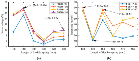 Variation of output voltage and enhancing ratio of FSEH with the length of the flexible spring: (a) output voltage; and (b) enhancing ratio.