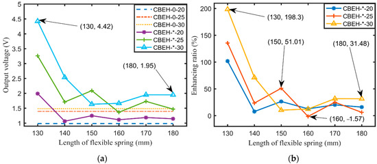 Output voltage and enhancing ratio of CBEH as a function of the length of the flexible spring: (a) output voltage; and (b) enhancing ratio.